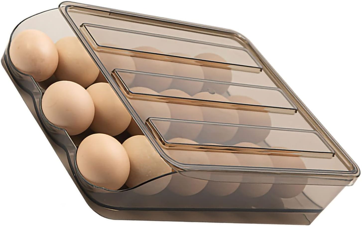 1.Our egg containers can be stacked for storage, each layer is fixed with a slot, very stable when stacked, you can stack other things on top, save space in the refrigerator or kitchen.2.The egg holder is transparent, so you can clearly see the number of eggs, making it easy to replenish eggs in time; the top cover is removable, making it easier to load eggs and clean.Specification:Item Type: Automatic Rolling Egg Storage RackMaterial: /PETPackage List:1 x Automatic Rolling Egg Storage Rack