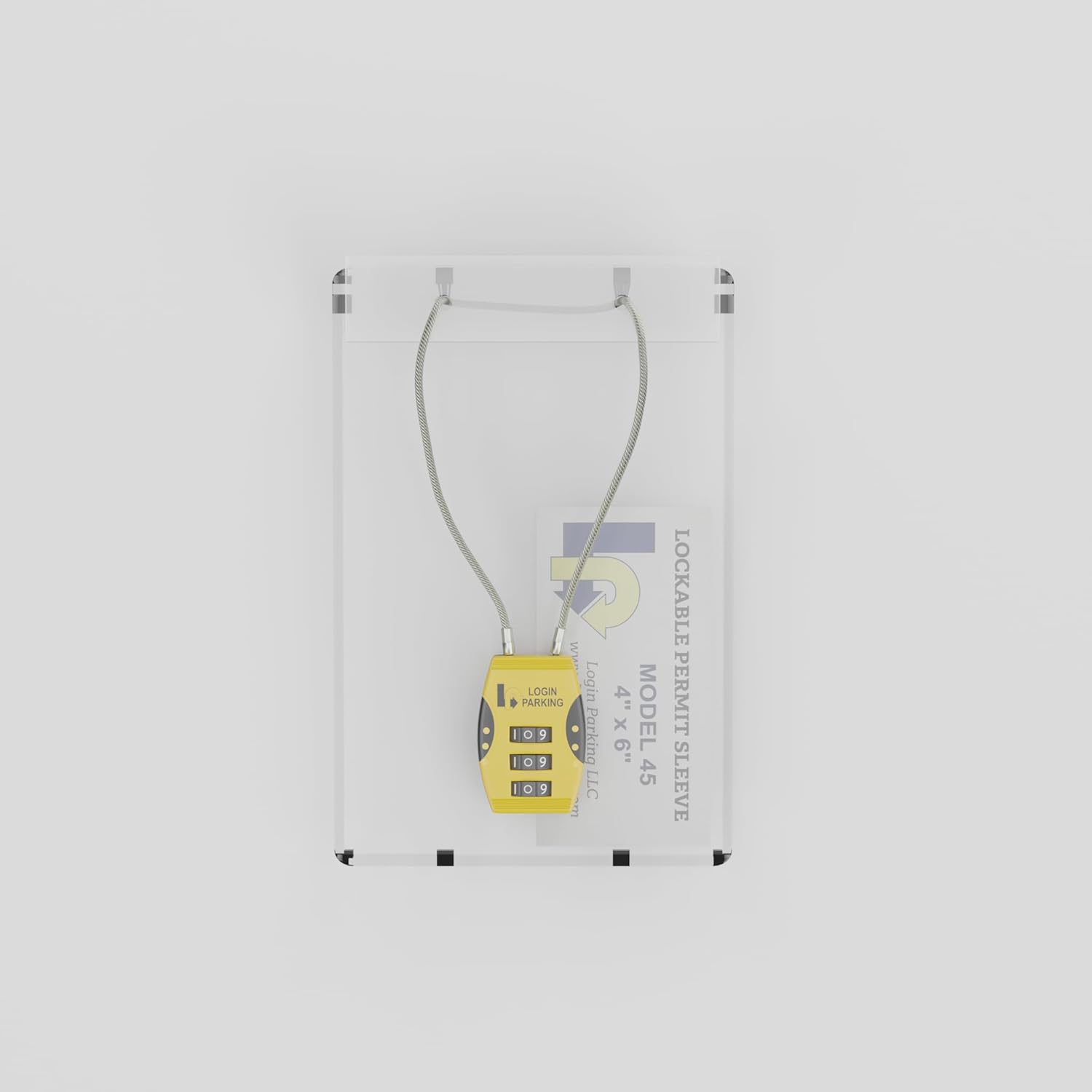 Safeguard your parking receipt or latge permit with the Locking Parking Permit Holder - Model 45. This durable holder securely displays your permit. The clear plastic case is made from UV resistant PVC and allows easy visibility, while the plastic coated aircraft aluminum cable can be tethered to the handlebar or steering wheel. The lock is a 3-code user settable security device. Keep your permit secure and avoid costly fines or citations with this practical solution. The inside dimenstions are 3.75" x 5.75". It fits most standard parking receipts and large permits. The holder is ideal for commuters, students, or anyone needing to display a parking receipt or pass. Great solution for golf carts, convertibles, motorcycles, and scooters. Made in the USA by Login Parking LLC since 1998.